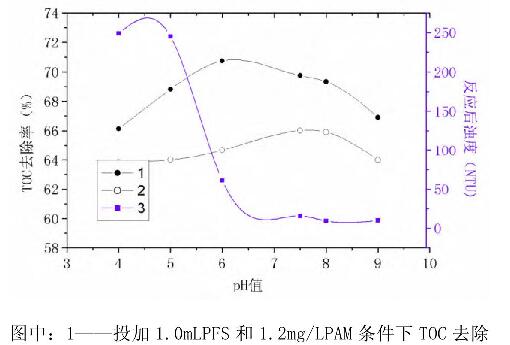 兩組實(shí)驗(yàn)攪拌結(jié)束后靜置30min取上清液測(cè)TOC濃度和濁度。結(jié)果見(jiàn)圖3所示。率隨pH值的變化曲線;2——投加1.4mL聚合硫酸鐵條件下TOC去除率隨pH值的變化曲線;3一一投加1.OmL聚合硫酸鐵和1.2mg/LPAM條件下反應(yīng)后濁度隨pH值的變化曲線。